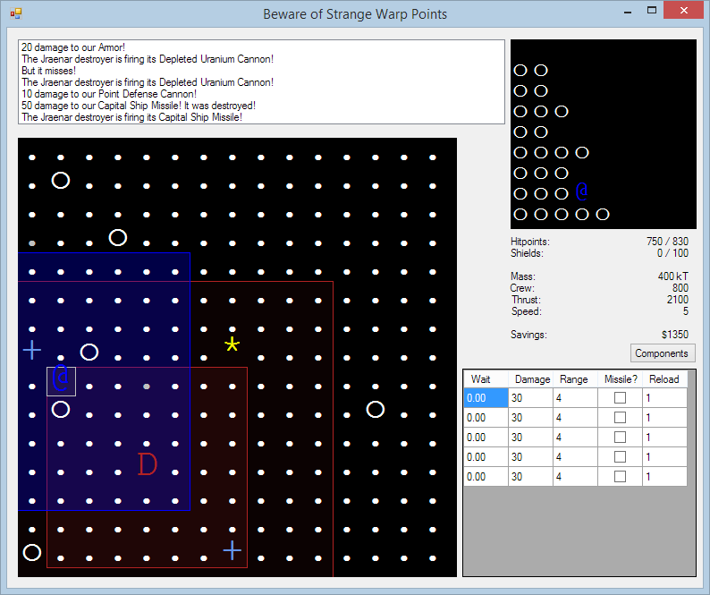 Beware of Strange Warp Points (aka BOSWP) is my entry for the 2014 7DRL Challenge. It's a roguelike based on the Space Empires games by Malfador Machinations. The Jraenar have invaded Terran space, and the fleet is decimated - you're our only hope! Destroy the cloaked Jraenar shipyards, and use the minerals salvaged from enemy ships to upgrade your own ship. I wrote BOSWP in C# using Windows Forms, so you'll need the .NET Framework to run it (version 4.0 will work if you're on Windows XP). (You should also be able to run it under Mono, but I haven't tested that.) Download latest version or original 7DRL version! (Or check out the source code!)
